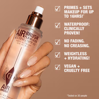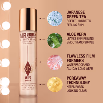 Airbrush Flawless Setting Spray weightlessly primes and sets for up to 16 hours* for the perfect looking makeup day, every day. Instantly lock in your look with Charlotte Tilbury Airbrush Flawless Setting Spray for makeup magic that looks just applied! This delicately scented, long-lasting, next generation setting spray is a magical beauty amplifier inspired by the smoothing, pore blurring effects of Charlotte's world-famous airbrush makeup family. The high - performance formula works in harmony with your complexion-enhancing foundation, concealer, bronzer and powder to create a weightless veil of hydrating goodness and a flawless - looking finish! No melting, no fading, no creasing!